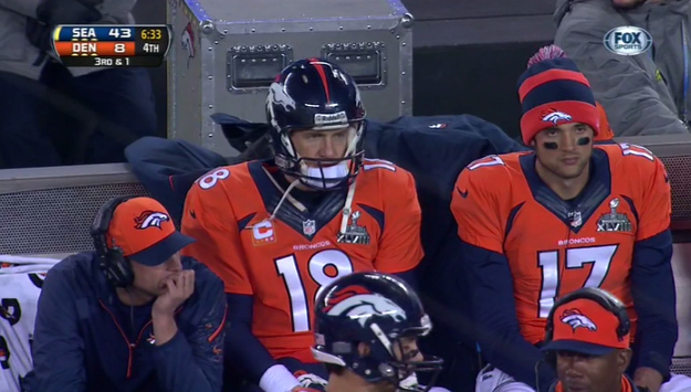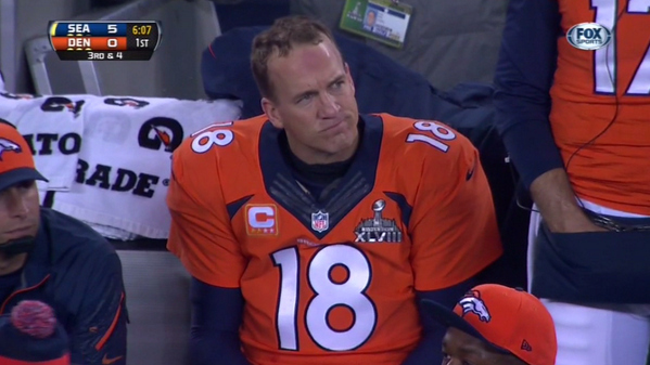 Not that it should be a big surprise, but images of Peyton Manning (and other Bronco’s fans) looking incredibly disappointed in the Bronco’s performance last night are popping up all over the internet.